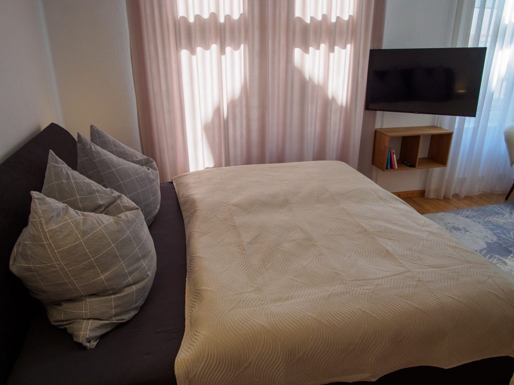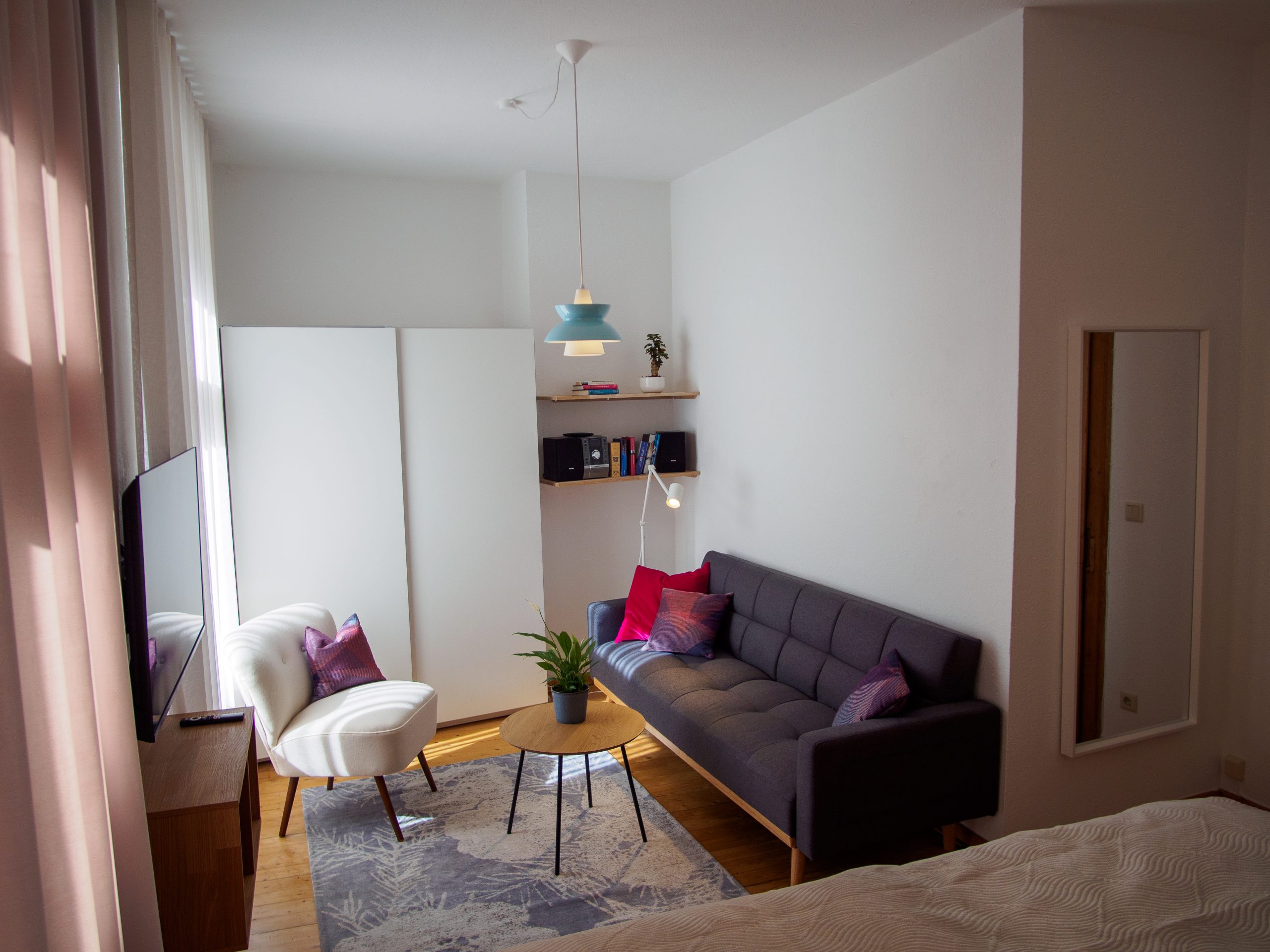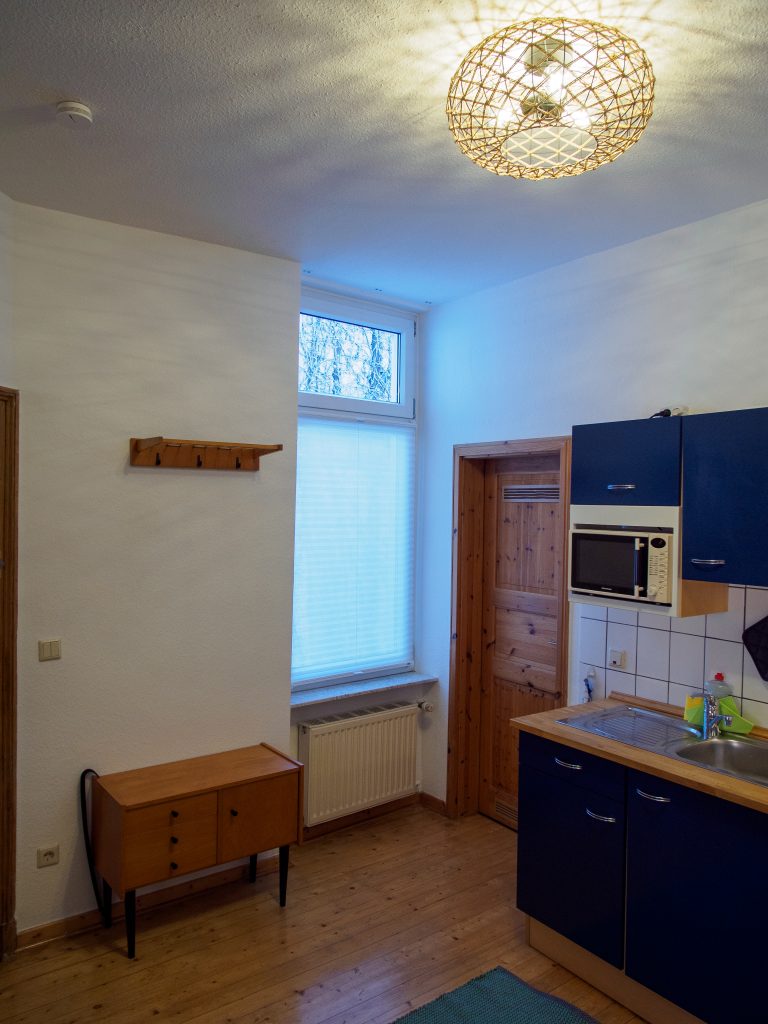 Unsere Unterkunft besticht durch einen angenehmen Schlaf-/Wohnraum, eine gut ausgestattete Küche, hohe Decken und einen authentischen Dielenboden. Die Einrichtung ist schlicht und stilvoll, was eine gemütliche Atmosphäre schafft.
